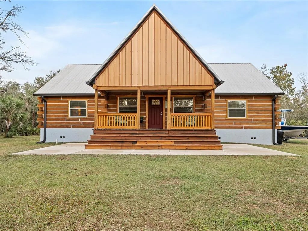 Discover a truly extraordinary property with this custom-built log cabin, a rare gem in the heart of Florida. Set on nearly six acres of peaceful countryside, this home offers the perfect combination of privacy, tranquility, and modern conveniences, all while being just minutes from town. You are greeted by a covered front porch providing a cozy space to unwind and take in the surrounding nature. Inside, the open floor plan showcases soaring cathedral ceilings, creating a bright and spacious living area. This 3-bedroom, 2-bathroom home is thoughtfully designed, featuring a primary suite with a private ensuite bathroom and two additional bedrooms that share a convenient Jack and Jill bath. The kitchen is a chef's delight with stainless steel appliances, ample workspace, and easy flow to the dining area, where double French doors lead to the screened-in lanai. A laundry room with built-in cabinets and counter space adds practicality to the home. Outdoors, the heated pool, complete with a new salt cell generator, is the centerpiece of the expansive lanai, offering an ideal spot for relaxation and entertaining. Beyond the pool, the property features a stocked pond with a dock, perfect for fishing or simply enjoying the serene water views, all while two sheds provide extra storage or workspace. Modern upgrades and amenities include a whole-house reverse osmosis system, a grinder pump septic system, and a new pressure tank for the well. The home is built to last with hurricane impact windows and a durable metal roof. This is not a kit home but a one-of-a-kind masterpiece, crafted with care and distinction. Offering abundant wildlife, scenic views, and unmatched tranquility, this property is the ultimate retreat. Schedule a private showing today to experience the unique beauty of this custom log cabin.