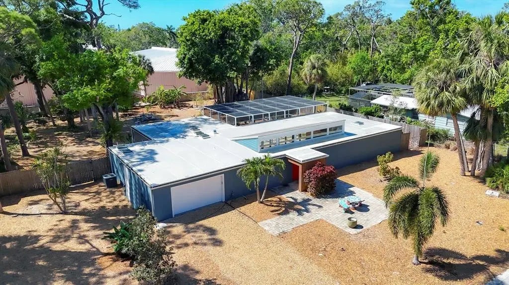 "WEST OF TRAIL" THE SELLER IS MOTIVATED. BRING OFFERS. PRICED BELOW FEB APPRAISAL. Discover this stunning home, showcasing the best of mid-century architecture. Situated on an expansive 100 x 170 lot, the grounds are adorned with fruit trees and lush landscaping. The large open living room features clerestory windows, with backyard and pool views through all glass doors. There is a small office nook as well. The 40x10 lanai, heated screened pool, and hot tub offer a relaxed and enjoyable outdoor space, as do the large front and back yards. There is gorgeous wood flooring throughout. The primary bedroom boasts a wall of closets, a beautiful pool view, and a distinctive large bathroom with unique shower featuring tile and glass block. The second and third bedrooms are designed as a separate suite featuring privacy and and extra storage. The open kitchen, enhanced by a skylight and pantry, is both spacious and inviting. The studio/library, illuminated by cove lighting, includes built-in shelving and a lovely backyard view and could easily be converted to a 4th bedroom. The home has a propane driven whole house generator, mostly hurricane impact windows and hurricane shutters as needed. The home abuts the 100 acre New College campus affording huge greenspace views and trails. It is just down the street to the Sarasota Bayfront for breathtaking sunsets, and abundant bird and marine life viewing . The Ringling Museum and Asolo theater are minutes away. Don't miss this opportunity to make this extraordinary home your own.