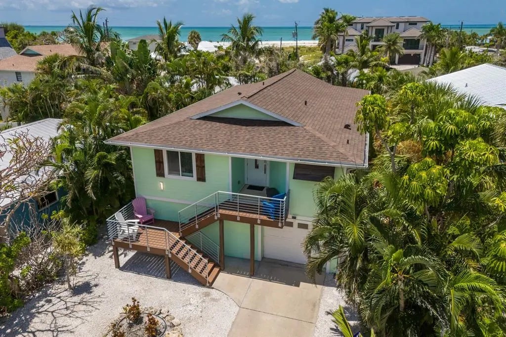 Welcome to Limelight — a beautifully appointed and fully furnished 3-bedroom, 2-bath coastal retreat ideally located on the coveted north end of Anna Maria Island, just steps from direct beach access. Light-filled interiors and swaying palms greet you upon entry, setting the tone for relaxed island living. Vaulted white wood-plank ceilings, custom millwork, wainscoting, and rich wood flooring create a warm and refined ambiance throughout the open living and dining spaces.