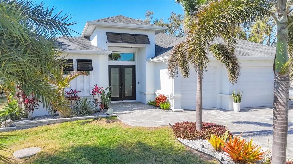 A Private Florida Sanctuary on a Rare DOUBLE Lot and transferable flood insurance! Step into serenity and sophistication with this meticulously upgraded 3 bedroom +flex room, 2 bathroom pool home nestled on an oversized double lot wrapped in lush, tropical landscaping. Designed for the ultimate Florida lifestyle, this residence is a true standout with refined finishes, thoughtful upgrades, and exceptional indoor-outdoor living. From the moment you enter, you’ll be drawn into the bright, open layout adorned with tray ceilings, crown molding, and expansive zero-corner sliding glass doors that fully open to reveal a private backyard retreat. Whether you're entertaining or relaxing, the custom saltwater pool with spa, outdoor fire pit, and spacious lanai create the perfect backdrop. The kitchen is both beautiful and functional, featuring granite countertops, soft close cabinetry, and a layout that keeps the chef connected to the action. The primary suite is a peaceful escape with a spa like bathroom, dual vanities, a walk-through shower, private water closet, and transom window that invites in soft, natural light. Smart and stylish upgrades continue throughout with impact windows and doors, spray foam insulation for energy efficiency, and a 30-amp generator hookup for peace of mind. The oversized two-car garage is showroom-ready with epoxy flooring, custom cabinetry, and plenty of space for your tools and toys. Tucked in a quiet neighborhood with no HOA requirements and low-maintenance living, this home offers both comfort and confidence, ideal for seasonal or full-time living. Better than new and move-in ready, it’s not just a home, it’s a lifestyle.