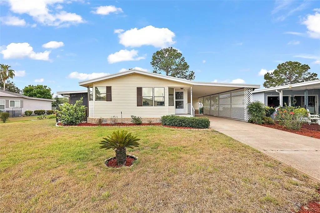 This 2 bedroom 2 bath home is situated on an oversized lot just a stone's throw from the Fox Run Clubhouse and main pool. The open floor plan enhanced by the vaulted ceilings, skylights and textured drywall walls give this home a welcoming and upgraded feel. The large kitchen has plenty of cabinet and storage space as well as an eat-in breakfast nook. The formal dining area with its built-ins is located off of the living room accessing your home office and enclosed side porch. The Primary Suite is in the rear of the home affording you privacy and space. The oversized bedroom includes a walk-in closet and adjoins the dressing area which includes a vanity, two lavatories and walk-in shower. The oversize 14'x40' carport has plenty of room for your vehicles and golf cart with direct access to a large storage / workshop to its rear. Enjoy the community activities Fox Run has to offer with access to the "Harris Chain of Lakes", all of which is anchored around its clubhouse, two pools and marina. Don't wait, call today and see what the Florida Lifestyle is really like.