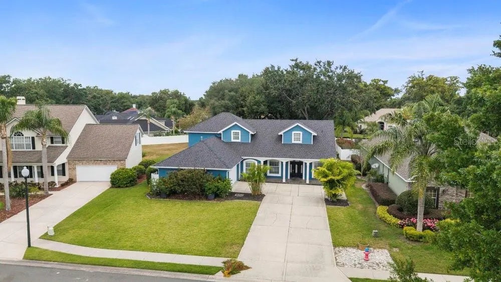This exquisite custom built 5 bedroom, 3 bath, pool home in the desirable Park Place community offers the perfect blend of comfort, style, and location. From the inviting covered front porch to the private backyard retreat, every space is designed for relaxed Florida living. Inside, you’ll find finished concrete floors in the entry, dining, and living areas. The open concept kitchen is packed with features: concrete countertops, stainless steel appliances, an island with built-in microwave, induction cooktop, built-in oven with separate warmer, under cabinet lighting, and a breakfast bar with seating. The kitchen and living room both have views of the screened-in pool area, accessible through glass double French doors. The living room also features a cozy gas fireplace. The primary suite is located on the first floor, privately tucked away from the main living areas. It features French doors that open to the pool, a large walk-in closet, and a spa-inspired ensuite with a garden tub and oversized walk-in shower. Upstairs offers four additional bedrooms and a full bathroom, giving everyone their own space. You'll also appreciate the indoor laundry room with cabinet storage and sink, real hardwood stairs, and a side-entry 2-car garage with an 8' door and extra bump-out for added storage. Step outside to your own private oasis with a screened chlorine pool, hot tub, rock accents, stylish decorative wall, and a beautiful waterfall feature that ads a peaceful resort style vibe. There’s also plenty of room for outdoor dining and entertaining, gas line pre-installed for a future outdoor kitchen, plus a pool heater to keep the spa ready all year round. Park Place is a sought after lakefront community with private access to Lake Joanna, a resident only dock and boat ramp perfect for boating, kayaking, or simply enjoying the water. Plus, you're just minutes from downtown Mount Dora and Eustis, shopping, dining, and medical centers. New downstairs HVAC system installed September 2025.