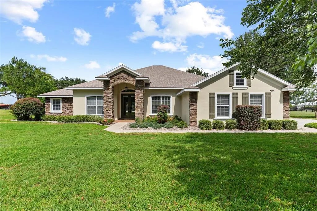 Situated on 2 fully fenced and gated pristine acres, this remodeled 5 bedroom 3 bath home is now available! As you walk towards the double door entry way, you notice right away the meticulous landscaping. From the moment you enter those doors, you will fall in love with the light and bright open floor plan and gorgeous new laminate flooring through out. To your left you have your 5th bedroom/office/den and to the right your formal dining area. The large living room overlooks the stunning pool area. As you make your way into the kitchen, be prepared to say WOW! All new cabinetry with stunning new quartz countertops, top of the line appliances and breakfast area are all eye catching. While you enjoy cooking in your new kitchen, you can also enjoy all of your company in the oversized family room adjoining the kitchen that has french doors leading to pool area. The very large primary suite has room for a sitting area, double closets, double sinks, garden bath and separate shower area. Split bedroom plan with with all oversized bedrooms 2-4. Bathroom #2 features a tub/shower combo and double sinks. Bathroom #3 with a large shower, also works great as a pool bath. Large inside utility room with sink as well which leads to oversized 2 car garage with epoxied flooring. Brand new AC's too! Do you love to entertain? This house was made for it! You will love enjoying those hot summer days on your fully screened back lanai with beautiful pool and spa plus a massive summer kitchen area. Bring your RV/boat to park in the detached garage. Another wonderful perk to this home is this subdivision allows for some livestock. Located just a few short minutes to all of The Villages amenities such as restaurants, shopping, schools and more! Houses in this amazing neighborhood are hard to come by...Do not wait to see this basically brand new one!