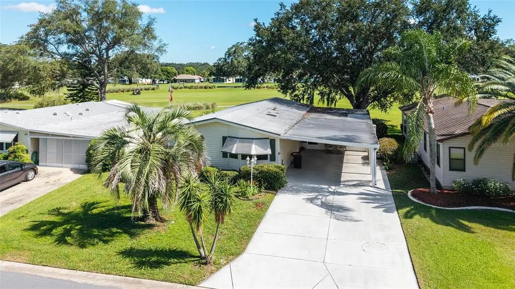 From the moment you arrive, you’ll be welcomed by a charming palm tree and a spacious, covered driveway with room for two vehicles. The oversized carport offers plenty of shade, and the golf cart garage provides excellent extra storage—complete with a refrigerator, washer, and dryer.