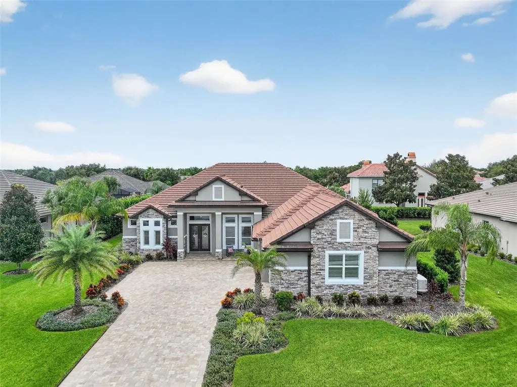 EXCEPTIONAL CUSTOM-BUILT ESTATE HOME IN PRESTIGIOUS LOCH LEVEN OFFERS AMAZING UPGRADES AND A CUSTOM 3-CAR GARAGE. Located 5 minutes from historic downtown Mount Dora is the highly sought-after, gated community of Loch Leven, offering tranquility, beautiful tree-lined streets, and estate homes on spacious parcels. The community setting is rich in natural beauty and borders Lake Loch Leven, a private 169-acre spring-fed lake, which residents enjoy via the community dock and boat launch. Welcome home to your beautifully designed and thoughtfully built home with integrity. At every turn, you'll find attention to detail, high-quality construction, and generous upgrades. The 0.34-acre yard is a carpet of lush grass, featuring palm trees and native Florida plants. The spacious paver driveway and 3-car courtyard-entry garage provide abundant parking for family and guests. Solidly built with block construction and beautifully finished with a stucco and stacked stone facade, a concrete tile roof, and a convenient covered front entry. Leaded glass doors open into a welcoming, bright interior offering a sleek design balanced with warm elegance. High tray ceilings, crown molding, recessed LED lighting, Plantation shutters, and LVT flooring flow throughout. Paint colors, flooring, and cabinet/counter materials are consistent throughout, creating a sense of continuity. All lighting is LED, and upgraded ceiling fans are throughout. Enjoy the energy-efficient benefits of spray foam insulation, including the garage and lanai. West side and exposed South side windows are tinted. Rheem high-efficiency air handler, tankless gas water heater, a 500-gallon propane tank, and a whole-house generator. This home is a dream! The open concept living, dining, and kitchen areas provide a seamless flow for entertaining. The living room tray ceiling adds an extra layer of elegance, and the kitchen boasts high-end finishes. Custom cabinetry, convenient storage drawers, upgraded stainless steel appliances (including a gas 5-burner cooktop), and Quartz countertops are finished off with a stunning Carrara marble backsplash. Upper/lower cabinet lighting, a hidden walk-in pantry, even knife and spice pull-out drawers! The adjacent dining area enjoys lanai views. Open the triple slider door to enjoy the covered screened lanai for parties or relaxation. A split-bedroom floor plan gives privacy for all. The luxurious primary suite features a triple-tray ceiling, lanai access, dual walk-in closets, and a spa-worthy en-suite with dual sink vanities, a free-standing deep soaking tub, and a doorless tiled shower. Bedroom 2 is private with access to a full bathroom and the lanai. Bedrooms 3 and 4 share a full bathroom, and bedroom 4 has a walk-in closet and a private door to the garage. The laundry room has storage cabinetry and a sink. Relax on the private screened lanai with water and gas lines in place for a future pool, pool heater, and summer kitchen. The garage is every man’s dream with loads of space, Shark Shield polyaspartic coated floors, one bay has a tray ceiling allowing room for a car lift, there’s a 30-amp outlet, a mini-split A/C, recessed lighting, a water spigot, a floor drain, and a private door to bedroom 4. Residents of Loch Leven enjoy amenities such as pickleball, tennis, and basketball courts. Convenient to shopping and dining. Easy Orlando commute. This home offers luxury living with everyday convenience.