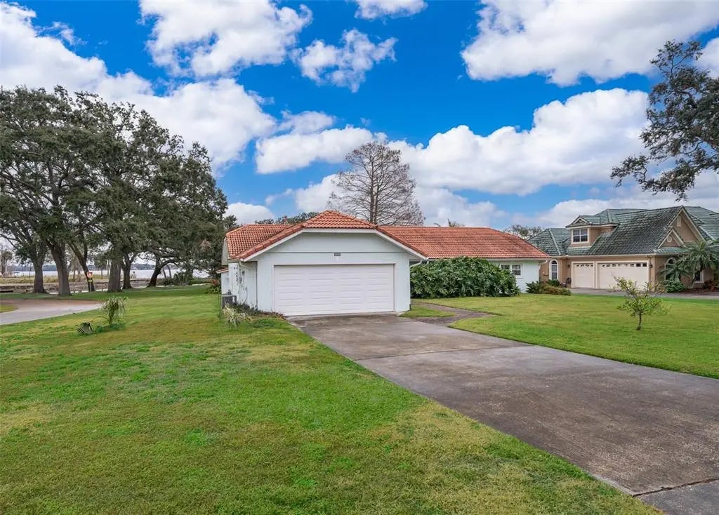 Under contract-accepting backup offers. UNMATCHED WATERFRONT LIVING – This exceptional lakefront home in Beverly Shores offers 3,045 sq/ft of thoughtfully designed space, featuring 4-bedrooms (including 2 master suites) and 3-bathrooms, set on a large half-acre lot. Boasting stunning panoramic views of Lake Griffin and direct access to a private island, with lake front via deeded access, and includes both lake and canal frontage. The family room features soaring cathedral ceilings, exposed beams, and a large fireplace. Remodeled and nearly doubled in size by previous owner, the home blends modern updates with timeless style. Flooring throughout is a combination of tile and hardwood, while the kitchen and bathrooms feature solid wood cabinetry. The spacious kitchen comes equipped with a walk-in pantry, Jenn-Air range, and tile countertops, perfect for both cooking and entertaining. New Master suite has large bedroom, bath with oversized shower, his and her vanities and large walk-in closet. One bedroom has a desk/shelving unit installed along one wall that could be used as a home office area. Split floor plan with 3/2 on one end (original master suite, including DR and LR) and other end is new Master Suite (including FR, Kitchen and Breakfast Room). Laundry Rm has double laundry sink and room for hobby area. Garage is oversized with 18’ wide door and will accommodate an extended SUV. Out your back door is a covered deck adjoining a stone paver patio and a beautiful waterfront view. This is a perfect scenic escape – don’t let this captivating lakefront property slip away.