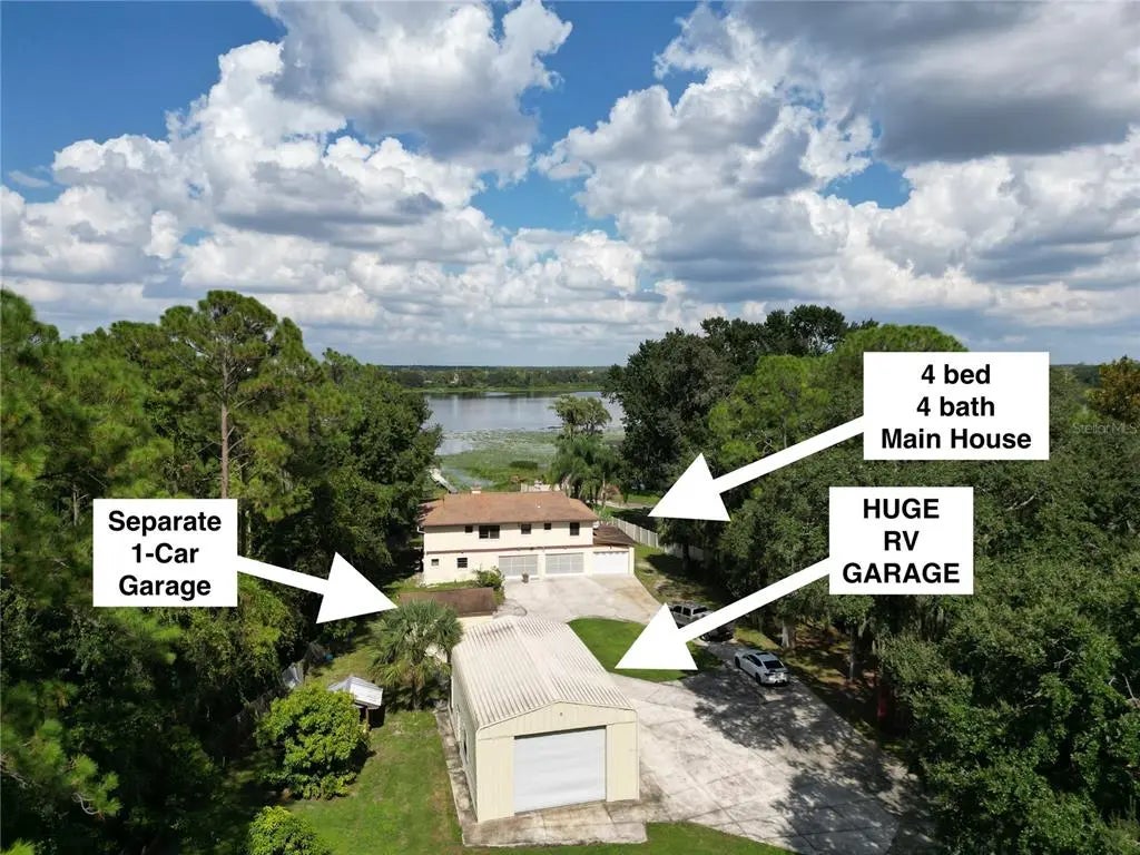 One or more photo(s) has been virtually staged. Welcome to 4981 Lake Cecile Dr—a rare opportunity to own a spacious lakefront property with unmatched potential in the heart of Central Florida. Situated on a 100-acre lake with 75 feet of private water-frontage, this versatile 4-bedroom, 4-bathroom property is perfect for anyone looking for space, flexibility, and a prime location near major attractions. There's NO HOA and it's close to the Airport - not to mention the AC is less than 5 years old and the water heater is under 1 year old too! Ideal for a visionary homeowner or savvy investor, this home sits on a generous lot with room for expansion or personalization. Whether you're dreaming of a private retreat, a full-time residence with room for hobbies and toys, or a potential Airbnb income property, this home offers the foundation to bring your vision to life. Unique features include RV parking, a detached one-car garage, an attached 3-car garage, and a shipping container for storage—plenty of space for vehicles, tools, or future workshop plans. The home also includes an unfinished outdoor kitchen that’s ready for your finishing touches, perfect for lakeside entertaining and enjoying Florida's beautiful weather. The property’s tranquil setting on Lake Cecile provides the best of waterfront living, with the option for boating, kayaking, paddleboarding, or simply enjoying the peaceful views. And yet, you’re still minutes from world-famous destinations—just a short drive to Walt Disney World, Universal Studios, SeaWorld, and all that Orlando and Kissimmee have to offer. You’ll also enjoy quick access to shopping, dining, medical facilities, and major highways like US-192 and SR-535, making travel and daily errands a breeze. Whether you're seeking a unique homestead, a vacation getaway, or a short-term rental investment in one of Florida's hottest markets, 4981 Lake Cecile Dr offers a rare combination of location, land, and potential. Bring your vision and make it your own—schedule your private showing today.