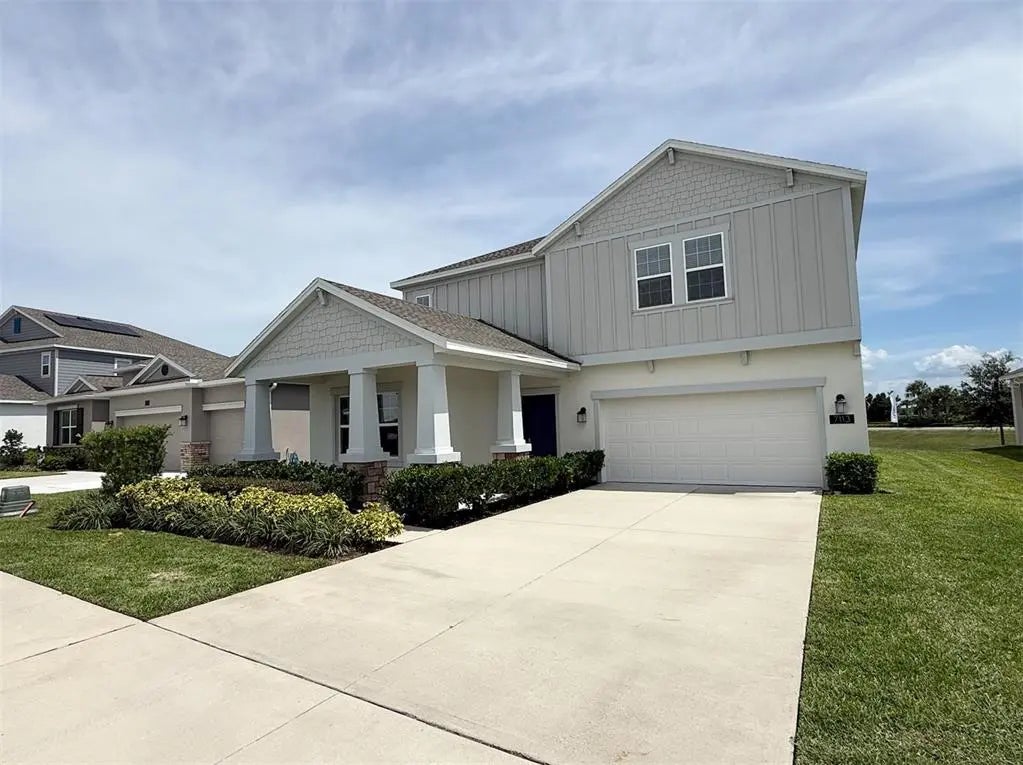 Under contract-accepting backup offers. Expansive, never-lived-in two-story former model home in the sought-after Trinity Lakes community! Featuring a 3-car tandem garage, this home offers a versatile flex room, first-floor guest suite, chef’s kitchen with quartz countertops, stainless steel appliances, and large island, plus an open living area with built-in tech center. Upstairs includes a spacious game room, luxurious owner’s suite with spa-style bath, and two additional bedrooms. Step outside to a covered patio and large backyard—perfect for creating your outdoor oasis. Home has a 6.375 KW solar system for energy efficiency. Located in Trinity Lakes, residents enjoy resort-style amenities: zero-entry pool with splash pad, fitness center, clubhouse, lakeside park with dock, walking trails, playground, and dog park. Just minutes from the Turnpike, you’ll have convenient access to Orlando’s premier attractions, shopping, dining, and entertainment. This is more than just a home—it’s the perfect lifestyle upgrade.