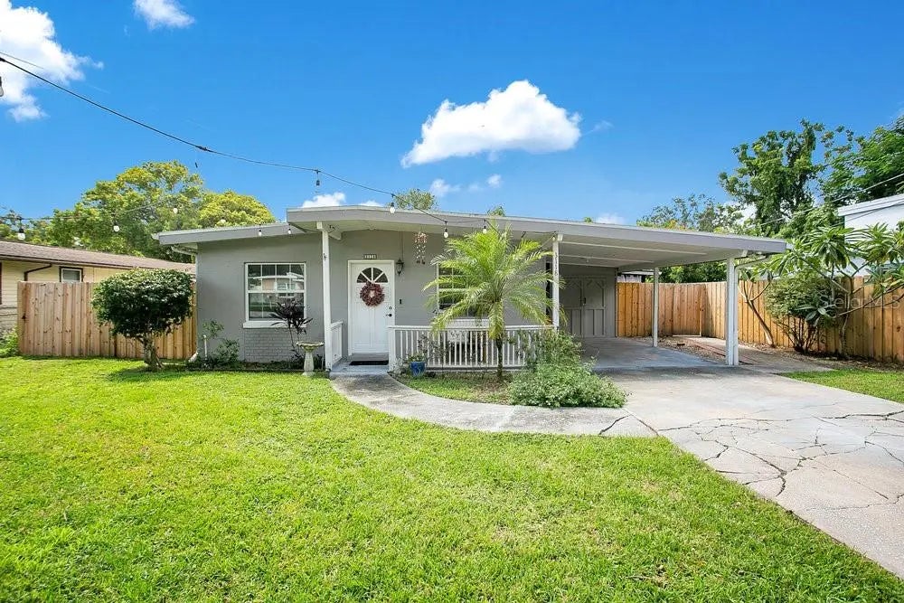 Under contract-accepting backup offers. Charming Mid-Century Ranch in Desirable Orlando Neighborhood This delightful single-story home offers comfortable living with thoughtful updates throughout. The open-concept living and dining area features beautiful tile flooring, modern ceiling fans, and abundant natural light from large windows with stylish bamboo blinds. The completely renovated kitchen showcases white Shaker-style cabinets, granite countertops, stainless steel appliances including refrigerator and range, and a functional breakfast bar with seating. The kitchen flows seamlessly into the living spaces, making it perfect for entertaining. The home includes well-appointed bedrooms with ceiling fans and ample natural light. One bedroom features attractive wainscoting and coastal-inspired décor. The full bathroom has been updated with modern fixtures, a granite vanity top, and colorful designer touches. A true highlight is the expansive covered outdoor entertaining area featuring exposed beam ceilings, string lighting, and ample space for dining and relaxation. The outdoor space includes both covered and open patio areas, perfect for Florida's year-round outdoor lifestyle. Additional features include a convenient carport, mature landscaping with palm trees, and a private fenced backyard. Don't miss the amazing detached block workshop that could be turned into your own private man-cave or she-shed. The property offers excellent curb appeal with a well-maintained exterior and lush lawn. Located in a quiet Orlando neighborhood with easy access to local amenities, shopping, and dining. This move-in ready home combines vintage charm with modern conveniences - perfect for first-time buyers or anyone seeking comfortable single-story living.