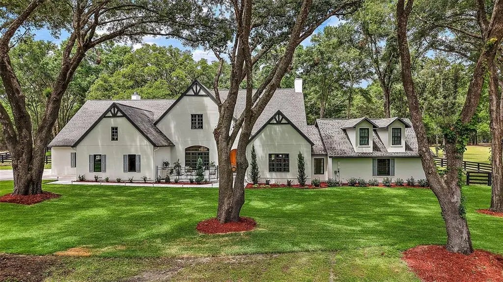 A formal entry gate, and long winding, tree-lined, driveway leads to the residence—a beautifully crafted home with a classic stucco façade, steep gabled roof, and charming dormer windows. The french courtyard (porche avant) welcomes you to sit and enjoy the breathtaking landscape before entering through the custom front door of the home. Once inside, the design balances warmth with sleek, modern finishes. The open-concept layout includes a sun-drenched living room with a fireplace, spacious dining area with extraordinary lighting, and a gourmet kitchen outfitted with premium stainless steel appliances, granite countertops, custom cabinetry, walk-in custom designed pantry, and a generous center island—perfect for both everyday living and entertaining. Even the meticulous, newly designed laundry/mud room will delight you! The home features four well-appointed bedrooms, three and a half bathrooms and an office.The first-floor primary suite with fireplace and french doors serves as a private retreat, offering serene views, a luxurious en-suite bathroom with porcelain tile floors and dual vanities, an elegant tub, detailed walk-in closet, and a roman walk-in spa shower. A separate, first floor area of the home also provides an in-law suite that adds flexibility and comfort for guests or extended family, complete with bedrooms, an exquisite bathroom, and private living and eating area. Perfect for an art studio or creative corner - you will be awed by the design and aesthetics of this lovely area of the home. A spacious laundry room with 15 ft counters, detailed closets and cabinets; an exquisite 1/2 bath for guests, as well as walk-in custom designed pantry are all on the first floor. The upstairs is equally magnificent with two bedrooms, a classic and neutral bath, an oversized bonus room for storage or work out room, and a library/reading nook. The spacious three car garage has epoxy floors, and has been meticulously maintained, as well as all new HVAC systems, hot water heaters, and service areas. Outdoors, the property invites relaxation and recreation. From the moment you lay eyes on the beautiful landscaping and aerated pond with fountain, you will be mesmerized with this estate. Enjoy alfresco dining on the screened rear lanai while enjoying the fireplace, explore the expansive grounds, or take advantage of the wooden outbuilding for storage, equestrian pursuits or farming. The ancient 300 year old oaks that frame the estate offer a tranquil setting ideal for walks, picnics, and peaceful reflection. New fencing around the entire perimeter of the 13+ acre estate allows pets and livestock to roam the majestic setting with privacy and security.