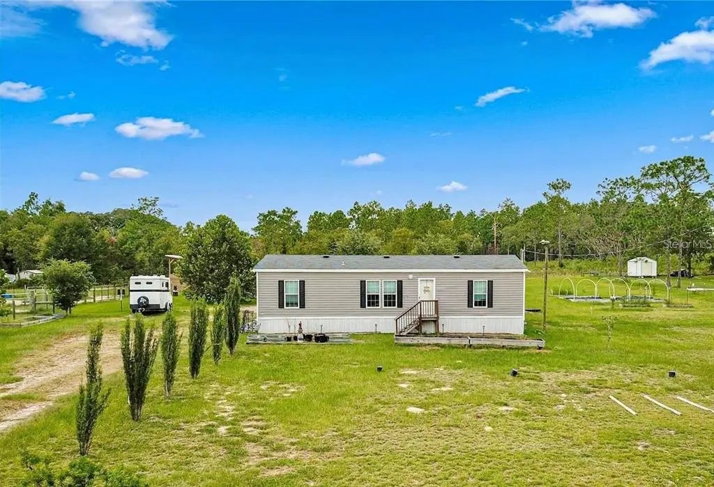 Under contract-accepting backup offers. BACK ON THE MARKET DUE TO BUYER’S FINANCING – NO FAULT OF THE HOUSE! THIS HOME QUALIFIES FOR A NO MONEY DOWN PROGRAM WITH NO PMI FOR QUALIFIED BUYER’S, CONTACT AGENT FOR MORE INFORMATION! Seller is motivated! With an acceptable offer the seller is willing to assist with the buyer’s closing costs, and the listing agent will provide a free one-year home warranty at closing! Step into this meticulously cared-for 2019 home that feels like new but comes with all the upgrades and charm you’ve been looking for. Nestled on 2 beautifully fully fenced-in acres this 3-bedroom, 2-bath home offers 1,296 Sqft of thoughtfully designed living space with a split floor plan that provides privacy and functionality. Galley kitchen featuring plenty of cabinet and counter space, perfect for preparing meals.Off the living room is the spacious primary bedroom, offering a en-suite bathroom and walk-in closet with ample storage. The additional bedrooms are equally comfortable, making this home perfect for families or those in need of extra space. Sliding glass doors lead to an expansive screened-in porch, where you can enjoy the peaceful surroundings or your morning coffee. Outside, the two-car carport and storage shed provide ample space for vehicles, tools and equipment. The property is fully fenced and divided into three pastures complete with a run-in shed and a chicken coop, making it ideal for horses, goats, chickens or other farm animals. Raised flowerbeds provide an excellent space for gardening or homesteading enthusiasts. Since the photos were taken, a privacy fence has been added along one full side of the property and half of the other side for added privacy and security. Located only 30-miles from the World Equestrian Center, Ocala, 8-miles from the Goethe State Forest and 18-miles from HITS. This property offers the freedom of No HOA or Deed Restrictions, giving you the flexibility to truly make it your own. Schedule your private showing today and discover all the features this mini-farm has to offer!