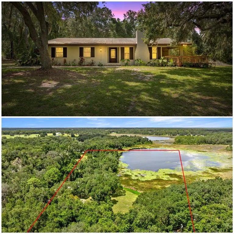 Your own slice of Florida paradise is waiting! This 8-acre lakefront oasis is tucked away in rural Florida on one of the best bass-fishing lakes in the region. Zoned A1 and unincorporated, you can bring your horses, pigs, chickens—whatever your heart desires. Launch your johnboat, airboat, or paddle craft right from your backyard and soak in pure Florida bliss along your private stretch of lakefront. Afterward, enjoy time at your private shooting range right on the property. The recently refreshed wrap-around deck gives you sweeping 180° views of the lake—perfect for sunrise coffee, evening barbecues, or simply counting your blessings. An XL detached garage with second-floor storage offers plenty of room for toys, tools, and all the extras. You’ll also have easy access to nearby trails for four-wheelers, side-by-sides, ATVs, and more. Inside, the spacious primary suite features private porch access overlooking the lake. Two additional bedrooms are set on the opposite side of the home in a desirable split floor plan. The large, open living area is filled with natural light and gorgeous lake views through big windows. Gather around the stone fireplace as golden hour settles over the water, or step outside through the sliding glass doors to the wrap-around deck. A converted garage bonus room with an oversized closet adds flexibility—ideal as a game room, man cave, or guest suite. The indoor laundry room (washer and dryer included) and durable flooring—ceramic tile throughout the main living area and luxury wood-look tile in the bonus room—add both comfort and convenience. The kitchen and bathrooms all feature granite countertops, while the primary ensuite includes a luxurious walk-in stone shower, private water closet, and spacious closet. Your dream home... A wedding venue.... A vacation spot... The possibilities are endless here. This piece of natural Florida won’t last long—schedule your showing today!