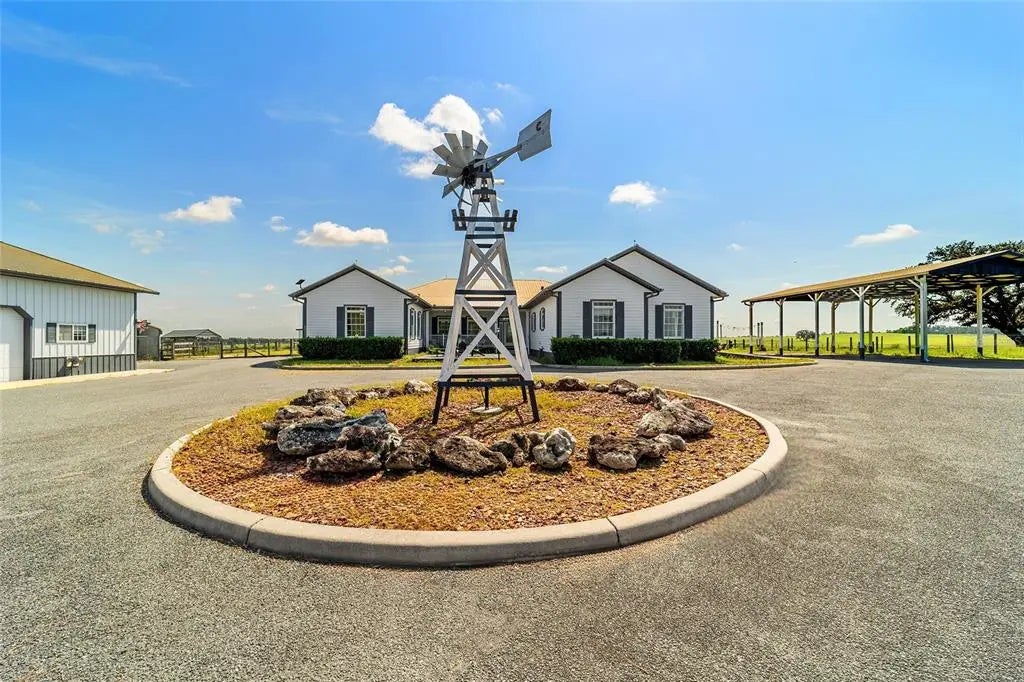 Modern Farmhouse Estate with Sweeping Views on 5 Acres. Perched atop a scenic hill with breathtaking views of over 100 acres of rolling pastureland, this exceptional 5-acre farm offers the perfect blend of luxury, privacy, and rural charm. As you pass through the gated entrance, a limerock drive leads to a circular asphalt driveway that brings you to the heart of the property—where a 6,000+ sq ft modern farmhouse, striking windmill centerpiece, and a collection of thoughtfully designed outbuildings await. A wide wooden front deck offers the perfect perch to enjoy panoramic sunsets or toast marshmallows by the fire. Step up to the charming rocking-chair front porch and peaceful koi pond before entering a foyer that opens into the light-filled main living area. The living room features cathedral picture windows, a gas fireplace with tiled surround, and French doors that lead to a private side porch with firepit and fenced area—ideal for cozy evenings. Porcelain tile floors and elegant chandeliers flow throughout the home. The gourmet kitchen is a chef’s dream with custom white cabinetry, a center island, eat-in breakfast bar, quartz countertops, and top-of-the-line Sub-Zero and Viking stainless steel appliances. A large stainless sink overlooks the backyard, while the open design creates a perfect space for cooking, entertaining, or morning coffee.