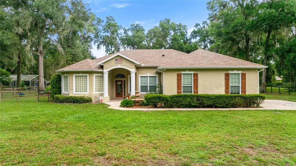 Beautiful 3 bedroom, 2.5 bath custom home with over 2,200 sq ft on a 1-acre AG-zoned lot. Enjoy peaceful country living close to Ocala and Gainesville. This home has a BRAND-NEW roof, high ceilings throughout, custom solid wood cabinets, and detailed tile work in the kitchen and baths. A huge foyer welcomes you as you enter—perfect for extra living space, a sitting area, or even a home office. The master suite offers his and hers walk-in closets, dual vanities, a large walk-in shower, and a soaking tub. The half bath off the back porch includes an outdoor shower, ideal for outdoor living or rinsing off after yard work. Relax on the large screened porch overlooking the fenced backyard, or take advantage of the 24×48 pole barn with a 12×24 enclosed shop complete with power and water—great for storage, projects, or equipment. Additional highlights include a double garage and a new water filtration system. Country charm with city convenience!
