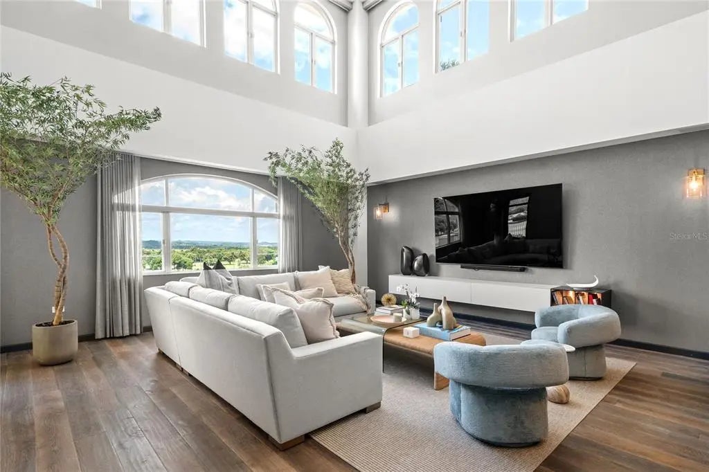 Upon entering the living spaces, be captivated by the grandeur of double-height ceilings in the expansive living room creating an atmosphere of elegance and spaciousness. The open floor plan harmoniously blends the living, dining, and kitchen spaces, which are adorned with state-of-the-art Sub-Zero appliances. Designed by renowned local interior designer, Caro Benezar, the interiors epitomize modern luxury and timeless allure. The penthouse features three en-suite bedrooms, each a tranquil retreat, with one conveniently located on the main floor and five lavishly appointed bathrooms—including three full baths and two convenient powder rooms. In addition, there is a dedicated office perfect for those who work from home with built-in cabinetry and views of the golf course.