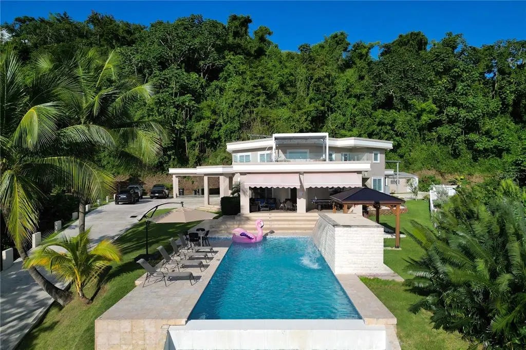 This impressive home, located in Carreras, Añasco, P.R., is a private estate offering 5 bedrooms, 4.5 bathrooms, and approximately 4,000 sq. ft. of construction on a 2,521 m² lot. It features 180-degree views of Puerto Rico’s West Coast and stunning sunsets through 20-foot ceilings and floor-to-ceiling windows. Designed for both relaxation and entertainment, the home includes an infinity pool with BBQ area, a detached studio with full bath, a custom basketball court, and a game room with pool table and PlayStation 5, comfortably accommodating up to 22 guests. Modern amenities such as a 50kW generator, 16k Outback solar system with 60 panels and net metering, storm-rated windows, gated entry with surveillance, two laundry areas, and a chef-ready kitchen with commercial appliances ensure convenience and peace of mind. Surrounded by lush landscaping with fruit trees including cacao, rambutan, parcha, and lemon, this property combines privacy and luxury just 20 minutes from the beaches of Rincón. CRIM: $2,729 annually