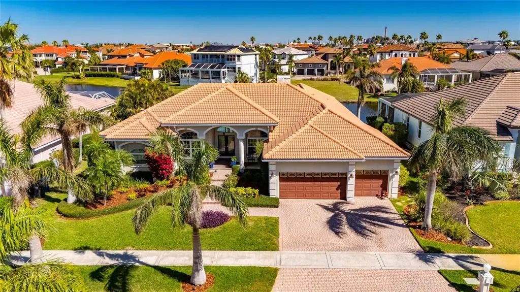 Under contract-accepting backup offers. 1335 Jumana Loop | Apollo Beach, FL 4 Beds | 3 Baths | Den | 3-Car Garage | Pool & Spa | Private Dock Slip (A8) Located in the staffed and gated waterfront community of Andalucia, this four-bedroom, three-bathroom home with a den and a three-car garage offers deep water access and a rare marina opportunity. The property includes assigned Dock Slip A8 at the Andalucia Yacht Club—an endcap slip that accommodates up to a yacht-sized vessel, with deep-water access and a jet ski lift available for purchase. The centerpiece of the home is a sprawling outdoor courtyard overlooking Alhambra Lake, featuring over 600 sq ft of covered space—one of the largest in the community. The screened lanai, installed in 2021 with no-see-um mesh, encloses a private heated saltwater pool and spa, perfect for entertaining or relaxing. The outdoor kitchen is fully equipped with a gas grill, refrigerator, dishwasher, ice maker, microwave, wet bar, and a stow-away TV. A fire pit, water feature, and covered lounge area complete the space. Inside, the open kitchen features gas appliances, granite counters, a decorative tile backsplash, cherry wood cabinetry with deep drawers, and stainless steel appliances. A breakfast nook and bar seating provide flexible dining options. The family room includes a fireplace and triple pocket hurricane-impact sliding glass doors that open fully to the lanai. The formal dining room is filled with natural light and overlooks the landscaped front yard. A dedicated office/den includes built-in cabinetry and workspace. The primary suite has hardwood floors, large pond-view windows, and impact doors to the lanai. The ensuite bath includes dual vanities, a soaking tub, and a walk-in shower. All three additional bedrooms have hardwood floors and custom closets. The second bathroom features granite counters and a tub-shower combo, while the third full bath offers lanai access with a walk-in shower and pedestal sink. Additional features include: Hurricane-rated windows and doors Generator with transfer panel (2018) Buried propane tank & gas appliances HVAC system replaced in 2021 Tile roof replaced in 2013 Updated pool equipment (2022) with remote control and new platform R-46 insulation, spa heater (2019), and heat pump water heater Andalucia amenities include a waterfront clubhouse, clay tennis courts, community pool, playground, private marina, and a pier with sunset views over Tampa Bay. This home is move-in ready and provides the ultimate Florida waterfront lifestyle with direct bay access and the rare bonus of a yacht-capable marina slip. Schedule your private showing today.