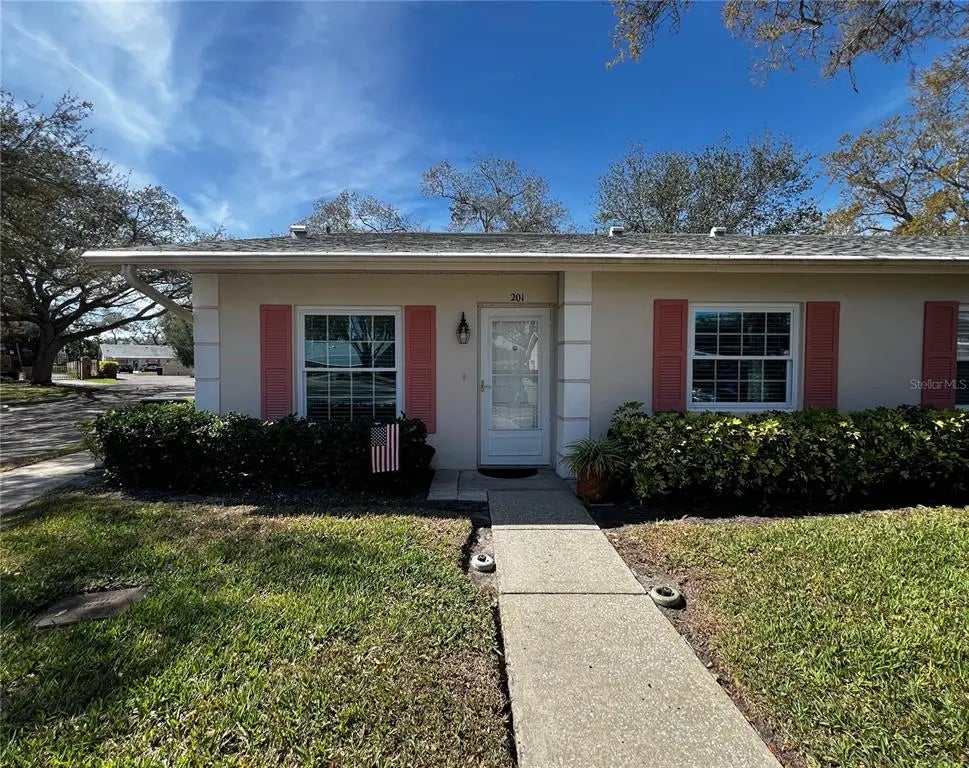 Welcome to Nelson Place- a highly sought after 55+ community in Clearwater that features ground floor villa style condos (with no upstairs neighbors), beautiful mature oak trees and landscaping, and is walkable to a Publix shopping center with a variety of stores. Enjoy the peace of mind being in a non-flood zone (Zone X)! This ground floor end unit has been meticulously maintained, and is highlighted by a wall of windows that bring in bright natural light throughout the entire condo. This villa has updated windows, a newer water heater, and boasts an open floor plan with two bedrooms and two bathrooms, a sunny Florida room, plus a back patio for enjoying the Florida weather or planting your favorite plants. The kitchen has an opening that is perfect for bar stool seating, plus space for a breakfast table. The living and dining room combo feature laminate flooring, a vaulted ceiling, and leads into the sunny Florida room at the rear of the condo. You also have a paver patio with space for seating, a grill, and your favorite plants. Both bedrooms have a window for natural light, and spacious walk in closets. The guest bathroom connects to the guest bedroom through a hallway that can be shut off from the main living space for a more private/ suite like feel, and the primary bedroom has a private attached bathroom with a walk-in shower. There is also an attic space for additional storage and a pull down ladder entrance. Enjoy the little things, like a spacious inside laundry closet, covered parking just steps from your door, a heated and spacious pool with plenty of lounge chairs to enjoy the sunshine, and a smaller community with just 31 condos. Publix is a short walk around the corner plus shops, restaurants, nail salon, gym, etc. Eagle Lake Park is a short drive from the community, as well as Clearwater Beach and both Tampa and St Pete/ Clearwater airports. This central Pinellas location is the perfect home base for you as you enjoy the best of Tampa Bay with our award winning beaches, shopping, restaurants, and golf. Don't miss out on this wonderful condo! Please note: no dogs allowed, only one cat or bird.