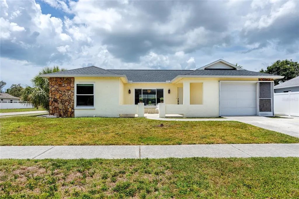 This lovely POOL HOME has NO HOA, NO CDD and is in a NO FLOOD ZONE. It's in the charming Holiday Lakes West neighborhood and blocks away from the Elementary, Middle and High Schools. All the the major ticket items have been updated within the last 5-6 years. The home boasts of a dimensional shingle roof (5 years old), hurricane rated windows(have a lifetime warranty), AC System (5 years old mol), water heater (new), water softener (six years old mol), reverse osmosis, disposal, Bosch dishwasher, pool has been resurfaced and the cool deck around the pool and back patio (new with 4 year guarantee). The home has painted inside and out and is light and bright. The kitchen has plenty of countertop space and a breakfast bar. The kitchen opens to the dining and family room. There is a sliding glass door from the family room to enjoy the pool view and is perfect for entertaining. The living room is spacious and can also be used as a combination formal living and dining area. There are two nice sized bedrooms with plenty of closet space. The primary bedroom has a sliding glass door that provides a private entrance to the pool area. There are plenty of closets for extra storage and the garage is an oversized for one car with extra room to add shelving for storage. The cool deck around the sparkling pool extends to the open patio where there is room to grill. The home is on a corner lot and the yard is fenced for privacy. The location is fantastic as it is a mile from Anclote River Park, the bike/walking trail, the public boat ramp, 3 miles from Tarpon Springs Sponge Docks.