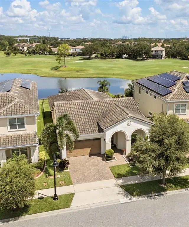 Discover peace and tranquility in this stunning, premium lot home offering both golf and water views in the highly sought after, 24 hour Guard-Gated, amenity-rich Golf Course Community of Eagle Creek. This Stunning four-bedroom, three-bathroom residence boasts an open-concept living area with soaring ten-foot ceilings, creating a spacious and airy feel throughout. The gourmet kitchen is a chef's delight featuring an oversized island perfect for gatherings, a walk-in pantry for ample storage, and sleek and modern finishes. Charming white brick accents add warmth and character to the home, elegantly showcased behind the stylish coffee bar and as a striking focal point in the living room, blending modern sophistication with timeless appeal. Elegant crown molding adorns the living areas and master bedroom. The spacious living area features stacked sliding glass doors that seamlessly open to a beautifully designed, enclosed paved lanai, perfect for indoor-outdoor living and entertainment. Here you can soak in breathtaking sunset views over the golf course and serene water vistas. The expansive master suite is a true retreat, featuring a luxurious walk-in shower, a freestanding tub, and a massive walk-in closet. Nestled just minutes from Medical City, Orlando International Airport, and world-renowned theme parks, this home is surrounded by top-rated schools and a vibrant community boasting exceptional amenities, including tennis and basketball courts, a community center, a fitness gym, three sparkling pools, and a fun-filled splash pad. No CDD! Schedule your private showing today!
