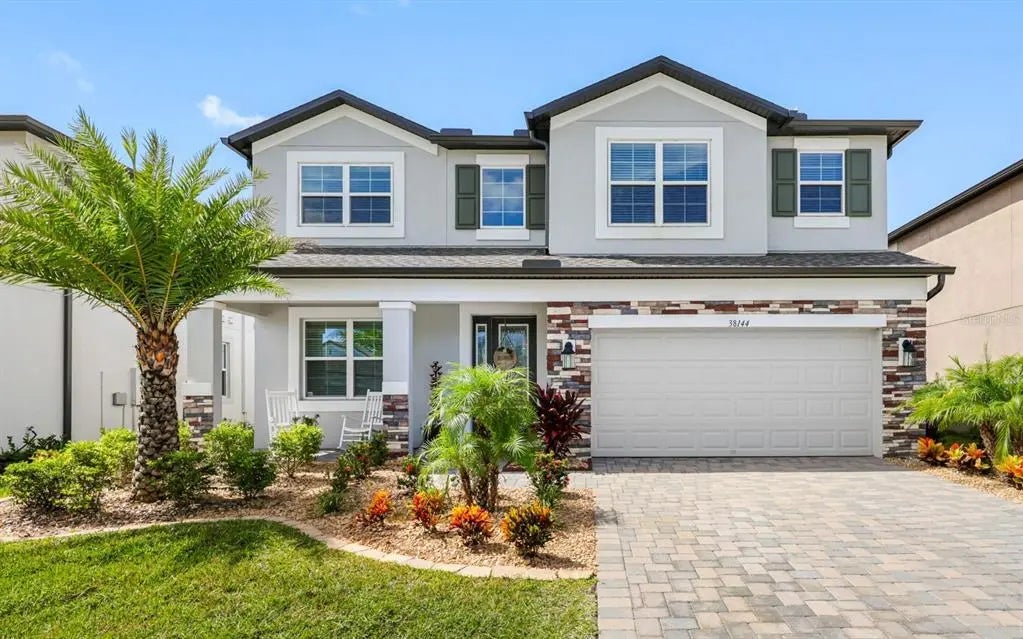 Welcome to the sought-after Cobblestone community in Wesley Chapel! This stunning MI Homes Mira Lago floor plan offers 5 bedrooms, 4 bathrooms, and a versatile bonus room, with a total of 3,761 square feet of thoughtfully designed living space. A unique highlight of this home is the rare dual primary suites - one on the first floor and one on the second - perfect for multigenerational living or hosting guests in comfort and privacy. Step inside to an open-concept layout designed for modern living and effortless entertaining. The expansive great room flows seamlessly into the gourmet kitchen, featuring an extended island, butler’s pantry, stainless steel appliances with a wall-mounted hood, oversized pot sink, quartz countertops, and a stylish tile backsplash. Gather around the electric fireplace in the great room for cozy evenings at home. The downstairs primary suite offers a serene retreat with a spa-inspired bath including a garden tub, walk-in shower, dual quartz vanities, and a spacious walk-in closet. Upstairs, an open bonus room provides a perfect second living area, office, or media space. The upstairs primary suite boasts a private balcony overlooking the conservation area, plus a luxurious bath with dual sinks, quartz counters, garden tub, walk-in shower, and expansive closet space. Three additional bedrooms share a full bath with a tub/shower combination. Additional highlights include: Tile flooring throughout main living areas - Plush carpet in all bedrooms - Inside laundry room with built-in cabinetry - 2-car garage with epoxy floors - Paver driveway for added curb appeal. Enjoy the privacy of east Pasco County while remaining just minutes from major roadways, shopping, dining, and entertainment. Why wait to build? Move in now and start enjoying the lifestyle you deserve!