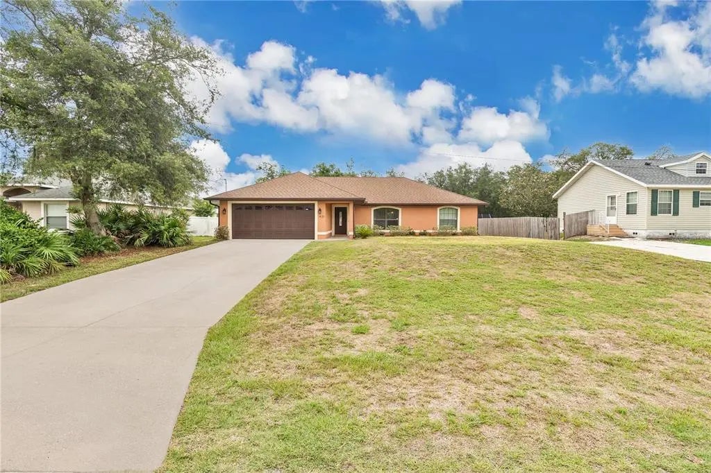 Under contract-accepting backup offers. Welcome to this charming 3-bedroom, 2-bathroom home with a 2-car garage, NEW roof, and NEW A/C! A covered front entryway welcomes you to an inviting open, split floorplan featuring vaulted ceilings, large windows, and beautiful wood-look tile flooring throughout. Natural light fills the spacious living and dining areas, which flow seamlessly into a well-appointed kitchen with ample counter space—perfect for both everyday cooking and entertaining. Just off the kitchen, you'll find a convenient indoor laundry room with a utility sink. The two secondary bedrooms are ideal for guests, a home office, or a growing family. The primary suite boasts a massive walk-in closet and a private en-suite bath for your comfort. Out back, enjoy a screened-in porch overlooking a large backyard—the perfect space for outdoor gatherings, gardening, or simply relaxing and enjoying the Florida sunshine. Square footage received from tax rolls. All information recorded in the MLS intended to be accurate but cannot be guaranteed.
