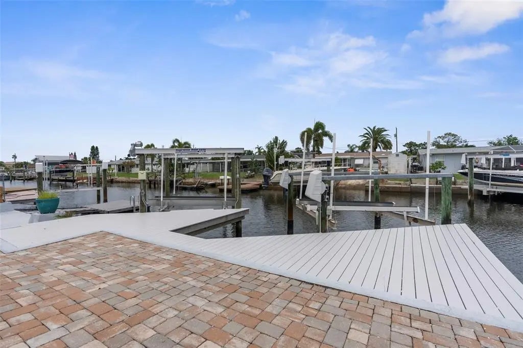 One or more photo(s) has been virtually staged. Back on market after undergoing renovations- Your coastal dream home awaits! This home comes equipped with 2 boatlifts, and floating dock. Opportunity for extra income potential, rent one lift and use the other for yourself! The backyard is all brick pavers with a large covered patio, outdoor shower, outdoor stainless steel sink, and so much room to entertain. The exterior has minimal grass, so weekends are spent on the water instead of doing yard work. There are also 2 sheds in the backyard for additional storage for fishing rods, coolers, you name it! This home is spacious with updated light fixtures throughout, Softclose kitchen cabinets with a large lazy susan, granite countertops and appliances are only a fewyears old. The woodlike tile is carried throughout the home, no mismatched flooring and easy to maintain. This home is truly turnkey with a fantastic layout. The roof is from 2018 along with newer windows and hurricane shutters. Don't miss the opportunity to own this coastal gem, great for a primary, vacation home or investment. Short idle to the Gulf, and easy to navigate.
