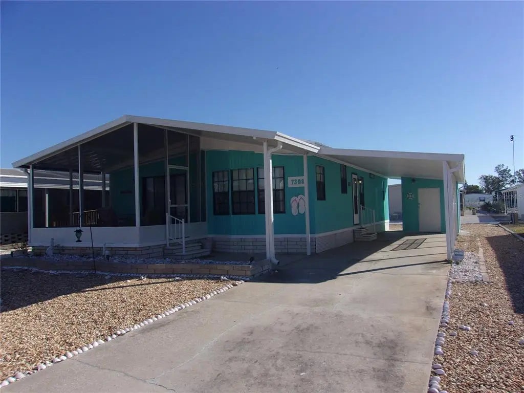Cute and cozy doublewide mobile in awesome Ponderosa Park! Wow, this home shows off pride of ownership and a great modern Beachy Vibe. Two large bedrooms, the Primary Suite features a full bath with shower, lots of closet space and ample room for the King Sized Bed! A roomy second full bath is there for guests, and is near the Guest Bedroom for convenience. Open Living area with beautiful luxury laminate floors, dining room and kitchen invites dinner parties and entertaining. Enclosed screened Front Porch is a great place to relax, and offers more space to chill. Large and convenienient Shed/Workshop is where you'll find the laundry, and the gravel yard is easy to care for. Best of all, this home comes furnished down to linens and dishes, even the decor remains!! In Ponderosa Park, you own the land, and the HOA fees are only $250/yr that includes beautiful Clubhouse and awesome Community Pool, as well as Bocci and Shuffleboard. Truly move-in ready and packed with value.