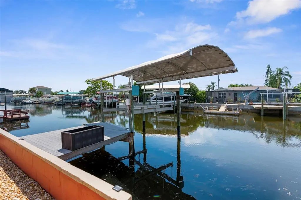 Assummable FHA mortgage-3.25% Interest rate with about a $300,000 loan balance!!! New seawall 2016, AC and waterheater 2024, roof 2019, flat roof 2021. This coastal home has been completely remodeled, but the real star of the show is the bonus Florida room and backyard. You'll find most of your days and evenings in the AC watching the water views in the Florida room, or outside at your bar top. Your weekends can be spent on the boat with about 15 min idle time to the Gulf. Your boat will be protected from the sun with the lift cover as a bonus. This home has plenty of parking between the car port, garage and addition parking pads. No need to worry about lawn maintenance, this house only has a few landscape beds and plenty of self maintaining palm trees, adding to the tropical vibe you are looking for. Stepping inside this beautifully renovated home, your notice the quartz countertops in the kitchen, upgraded light fixtures and a line of sight to the water from the front door. This home offers ample storage solutions from the indoor laundry closet to the walk in pantry/closet. Bring your boat and your golf cart and enjoy sunsets from your backyard, or take the golf cart to one of the neighborhood restaurants at Hudson Beach!